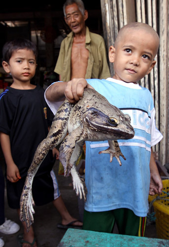 | Mohd Muqri Ramli, 5, menunjukkan katak gergasi Malaysia yang dijumpai ayahnya, Ramli Jaafar, 52, di belakang rumahnya di Kampung Chicha Tinggi Kelantan (pix-Syami suhaimi HM). Katak nama saintifiknya Limnoectus ini seberat 1.5 kg. Ia berbeza seperti katak kanibal di atas yang dipanggil Adspersus Pyxicephalus yang mencecah berat sehingga 2 kg dan boleh melompat 12 kaki serta mempunyai gigi taring. Katak Afrika di atas memakan tikus! |